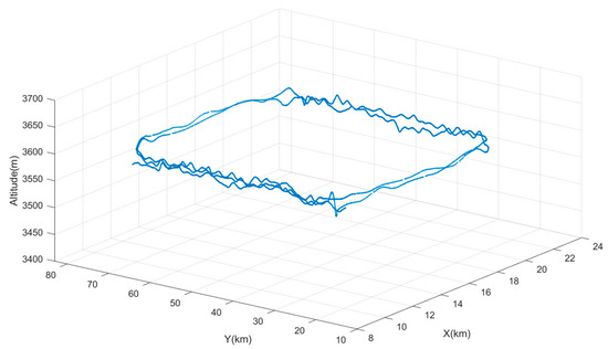 To ensure that the raw output of the gravity gradiometer only reflects dynamic measurement noise, a suitable flight altitude must be selected. At high altitudes, shallow surface or subsurface local targets have a negligible effect on the gravity gradient field. Over small areas, the gradient field appears constant, and it is reasonable to assume that gravity gradient data obtained at this altitude exclude gravity gradient signals caused by geological bodies. To achieve this, airborne gravity data for the area were collected. To establish a gravity gradient reference field, an upward continuation was performed using ground-measured data. Gravity anomalies on an observation plane at an altitude of 3600 m were calculated using arbitrary surface continuation theory, beginning with observed free-air gravity anomalies on the surface near the flight test area. Subsequently, frequency domain component transformation was then used to obtain gravity gradient anomalies and at this altitude. Figure 17 shows that gravity gradient component anomalies and within the black-framed area vary within 10 E, making this region suitable for high-altitude measurements at 3600 m. The actual flight trajectory is shown in Figure 18.