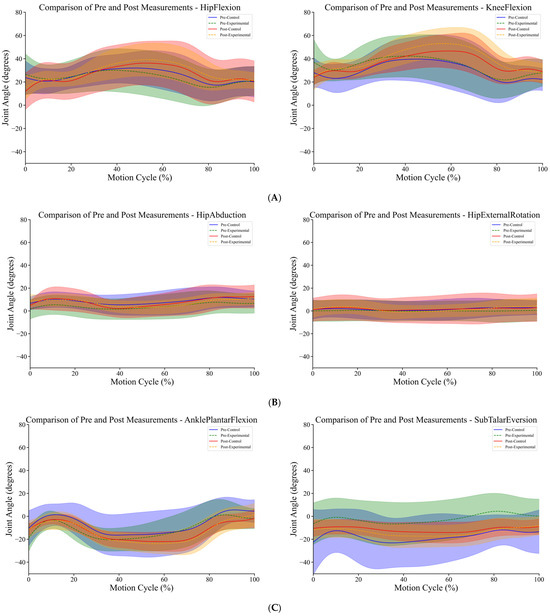 (A) Diagram of joint angle changes in hip flexion and knee flexion during single-leg jumps before and after intervention. (B) Diagram of joint angle changes in hip abduction and hip external rotation during single-leg jumps before and after intervention. (C) Diagram of joint angle changes in ankle plantar flexion and subtalar eversion during single-leg jumps before and after intervention. The shaded area represents the range of standard deviation.