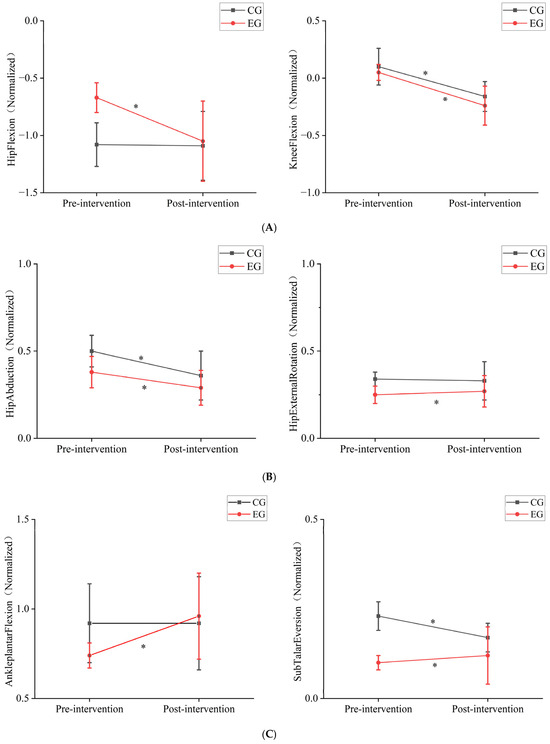(A) Diagram of joint torque changes in hip flexion and knee flexion during single-leg jumps before and after intervention. (B) Diagram of joint torque changes in hip abduction and hip external rotation during single-leg jumps before and after intervention. (C) Diagram of joint torque changes in ankle plantar flexion and subtalar eversion during single-leg jumps before and after intervention. * indicates a p-value < 0.01 for post-intervention vs. pre-intervention data.