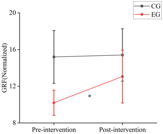 Diagram of ground reaction force changes during single-leg jumps before and after intervention. * indicates a p-value < 0.01 for post-intervention vs. pre-intervention data.