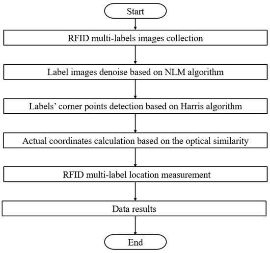 The overall process of the RFID multi-label location measurement in this paper involves collecting RFID multi-label images by using the two vertical CCDs, and then using the improved NLM to denoise the images to improve the image quality. After that, Harris detection is used to locate the corners required by the RFID multi-label network. Finally, the actual coordinates of each RFID label are calculated according to the similarity principle of geometric optics to determine the location of the RFID multi-label network. The specific flow chart is shown in Figure 1. In the designed RFID hardware-in-the-loop simulation system, two CCD cameras are used to obtain RFID multi-label images, the multi-label images are denoised by the fast NLM denoising algorithm with improved kernel coefficients, and then the improved Harris corner detection method is used to detect the detection points of the tags. Finally, the actual coordinates of the RFID tag are calculated from the coordinates of the multi-tag corner detection by using the principle of geometric-optical similarity, and then the measurement of the three-dimensional geometric distribution of the multi-tag network is completed, and the three coordinate values of each tag are output.