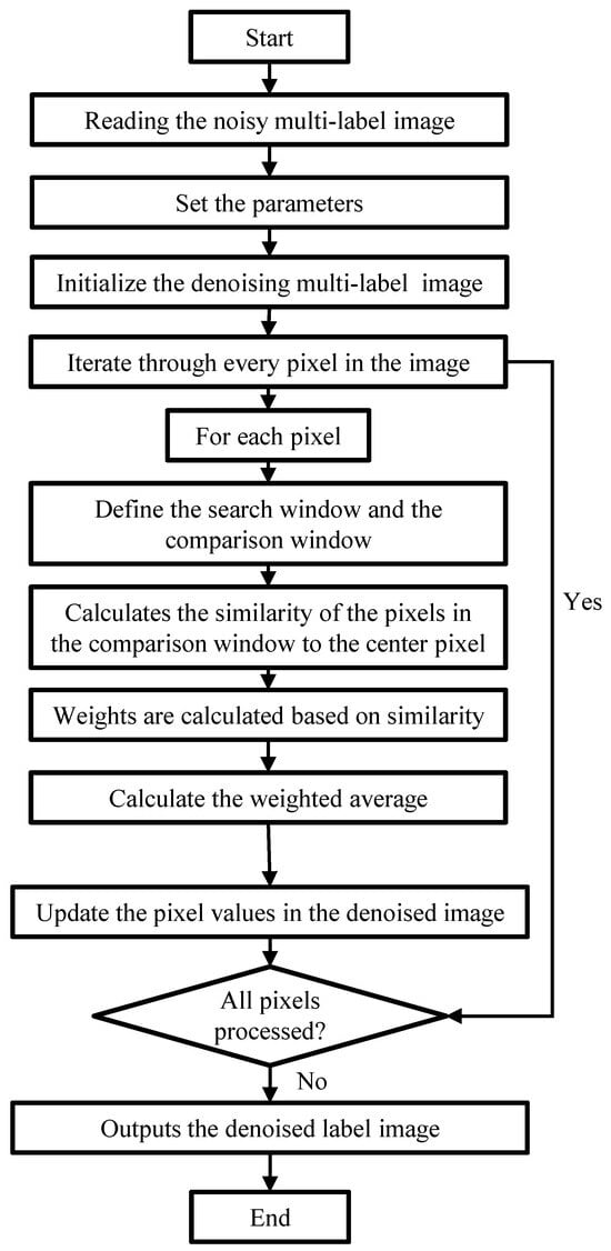 The principle of NLM is to determine the weight of the search window through the similarity between image pixels according to the kernel function of the whole image as a range, to achieve the purpose of image denoising. A detailed NLM flow chart is shown in Figure 2. To be specific, the fast NLM denoising algorithm with an improved kernel coefficient fuses the integral graph and the modified kernel function on the original NLM denoising algorithm and optimizes the denoising effect of the RFID label image by modifying the kernel function coefficient.