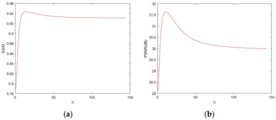 Function diagrams. (a) The function diagram between PSNR and h; (b) the function diagram between SSIM and h.
