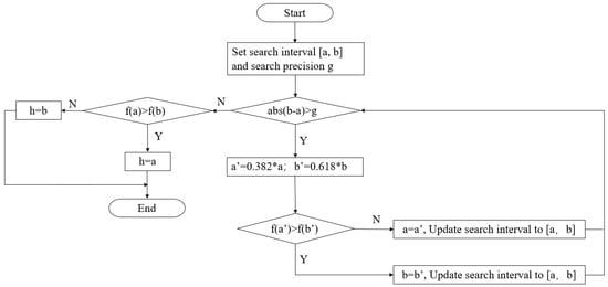 The golden section method is the development of the interval elimination method. By taking the golden section point as the trial point, it gradually reduces the search interval to obtain the extreme value of the single-peak function. As shown in Figure 3, the numerical relationship between h, SSIM, and PSNR is presented in the form of a single-peak function, which indicates that it is feasible to shorten the optimization time of h by using the golden section method. The algorithm flow of the golden section method for function optimization is shown in Figure 4.