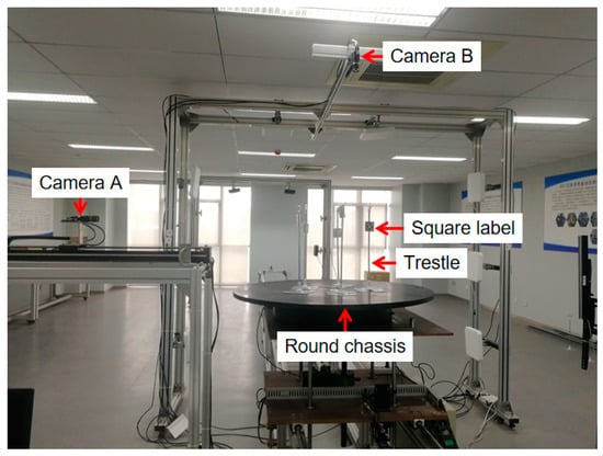 The research platform of this paper is the RFID semi-physical simulation system, and its physical configuration is shown in Figure 5. The system has two main functions: one is to obtain the furthest reading distance of labels by a laser rangefinder; the other is to obtain geometric distribution images of multiple labels by using two vertical cameras. The research in this paper only involves the image acquisition part, which is mainly composed of two vertical cameras A and B, a round chassis, RFID tags, and a trestle.