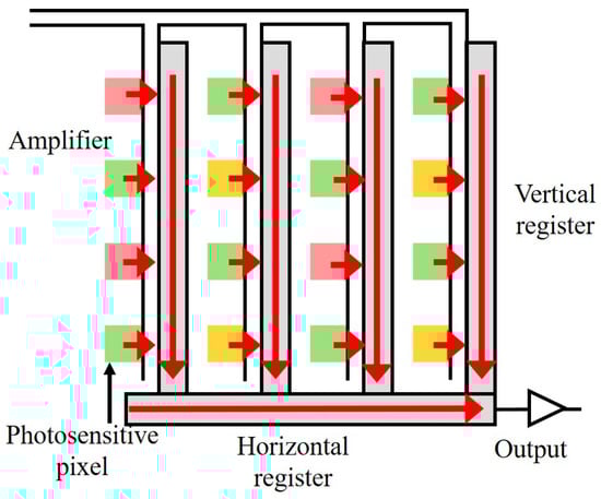 A CCD is a semiconductor device, which determines the imaging quality of the camera. The more units, the higher the number of pixels, and the better the imaging quality. The CCD is the most commonly used image sensor in machine vision at present. It integrates photoelectric conversion, charge storage, charge transfer, and signal reading. It is a typical solid-state imaging device. The outstanding characteristic of the CCD is that it takes charge as a signal, unlike other devices, which take current or voltage as the signal. The working principle of CCD chips is shown in Figure 6. The red arrow indicates the direction of charge transfer. A CCD camera is composed of an optical lens, timing and synchronization signal generator, vertical driver, and A/D signal processing circuit. As a functional device, a CCD has the advantages of no burn, no lag, low-voltage operation, and low power consumption compared with vacuum tubes. In the CCD sensor, after receiving the light, the photosensitive image point is directly output to the vertical register and transferred to the horizontal register, and finally a unified output can be formed. Due to the weakness of the electrical signal generated by the photosensitive element and the voltage loss generated in the process, the analog-to-digital conversion cannot be completed. Therefore, the amplifier is required to amplify the electrical signal, and then it is processed through the A/D converter, and output to the DSP processing chip in the form of a decimal digital winter image matrix. Finally, the signal is compressed by the microprocessor and stored in a specific image file format. When the camera is fixed, the blur of the image comes from the loss of multi-tag motion, illumination, and signal transmission. The relative motion between the moving label and the lens is an important factor affecting the image quality.