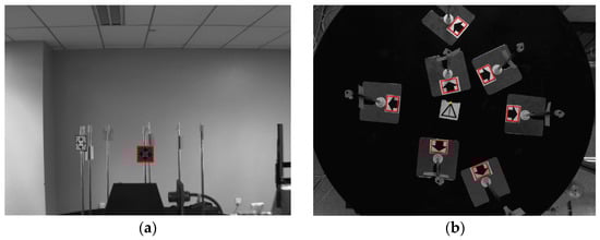 In view of this, in order to obtain the optimal geometric distribution to achieve performance optimization of multi-label systems, a multi-label performance optimization system based on semi-physical simulation is proposed []. Zhang et al. proposed recognizing and matching label images from different camera perspectives []. The main process involves using two vertical cameras to collect and record images of the geometric distribution of multiple labels, denoising and feature location of the image, and obtaining the three-dimensional (3D) coordinates of labels in a multi-label system. Then, this set of coordinates would be stored in the dataset as a multi-label network. In addition, the multi-label performance of a multi-label network is described by the maximum read distance of the multi-label system, which is measured by the laser ranging sensor at the moment when the reader cannot receive the label information [,]. The above process is repeated to obtain lots of multi-label networks and their corresponding longest read distances. When the data collection is sufficient, the optimal multi-label geometric distribution is obtained through an optimization algorithm such as SVM.