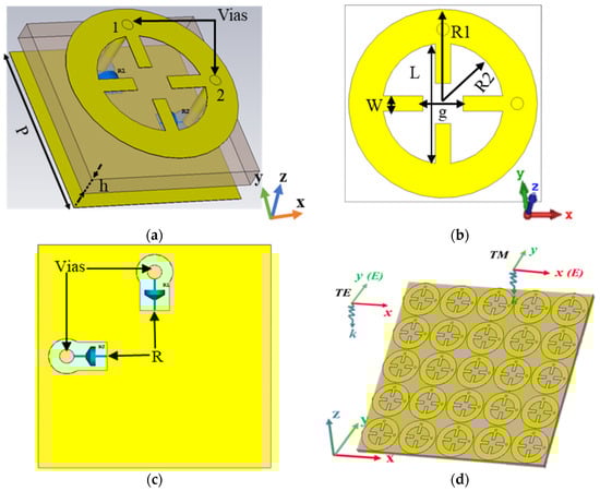 In this study, the MS unit cell is designed based on a wheel-shaped resonating structure, as depicted in Figure 1. The design incorporates an MDM structure, with the top metallic layer comprising a circular ring resonator to effectively interact with incident electromagnetic fields, while the cross-shaped slots enhance resonance and impedance matching. The bottom metallic layer serves as a ground plane. A dielectric substrate made of Rogers RO4003C with a dielectric constant of 3.55, tangent loss of 0.0027, and thickness of h = 1.524 mm is utilized to minimize energy loss. Furthermore, copper with a conductivity of 5 × 107 S/m and thickness of 35 µm is used to fabricate the top metallic resonator, vias, and ground plane. Two vias are positioned on the two sides of the wheel-shaped resonator. Two annular gaps are opened around the vias at the ground plane to accommodate a load resistance of 50 Ω.