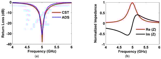 The return loss of the proposed MS unit cell was calculated using CST Microwave Studio and compared with the results obtained from aligned EM simulation software Advanced Design System (ADS) 2020, as shown in Figure 3a. From Figure 3a, the parameter was lower than −30 at normal incidence, indicating optimal performance with the minimal reflection of incident electromagnetic waves in free space. The figure compares the return loss (S11) results obtained from CST and ADS simulations, demonstrating a strong correlation at the resonance frequency of 5 GHz. The CST simulation, which employed 3D full-wave modeling, yielded sharper and more detailed results, whereas the ADS simulation, based on circuit-level modeling, simplified EM effects and resulted in a slightly broader dip. While there were minor discrepancies outside the resonance range, the findings effectively validate the design, emphasizing a trade-off between the accuracy of CST and the efficiency of ADS. The symmetrical design of the proposed MS unit cell made it insensitive to polarization. Therefore, the parameter for TE polarization was calculated. In addition, the normalized input impedance of the MS unit cell, terminated with 50 Ω resistor loads, was analyzed, as depicted in Figure 3b. At the resonant frequency of 5 GHz, the real part of the normalized impedance almost equaled 1, indicating a strong impedance match between the MS unit cell and free space. This resulted in efficient absorption of the incident wave, especially when 50 Ω resistor loads terminated the unit cell.