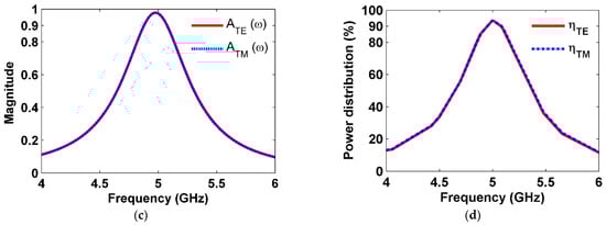 where and represent the power delivered to the load and power incident into the MS area. Figure 3d illustrates the conversion efficiency of the proposed MS unit cell for TE and TM polarizations. A higher harvesting efficiency peak of about 94% is achieved for both TE and TM polarizations under normal incidence.