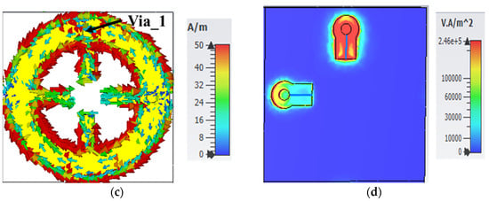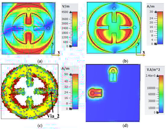 Figure 6 displays the electrical properties of the proposed MS structure at 5 GHz for TM polarization with normal incidence, including E-field, H-field, current surface, and power flow. As shown in Figure 6a, the E-field distribution was most concentrated along the x-axis, then flowed through the via hole to the resistor load (R2). The H-field was distributed along the resonator, and it was more concentrated on the inner side of the wheel resonator, as seen in Figure 6b. Accordingly, Figure 6c shows the current surface distribution. It is clear that the current surface was antiparallel at the top resonator and then flowed through the harvesting hole (Via_1) into the resistor load (R1). Finally, the power flow distribution at 5 GHz is shown in Figure 6d. It is noted that the most power absorbed by the top resonator was delivered to the resistor load (R1), resulting in high harvesting efficiency.