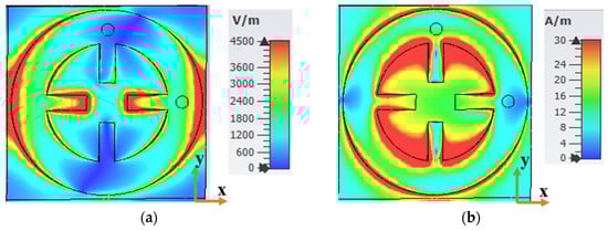 To demonstrate the polarization-insensitive abilities of the MS structure, analysis of its electric field (E-field), magnetic field (H-field), surface current, and flow power for both TE and TM polarization at the resonance frequency of 5 GHz was conducted. Full-wave electromagnetic simulations were conducted in CST Microwave Studio for both TE and TM polarizations. The MS unit cell was analyzed under periodic boundary conditions along the x- and y-axes to simulate an infinite array. A plane wave with normal incidence excited the MS structure along the z-axis. The results of this analysis are presented in Figure 5 and Figure 6.