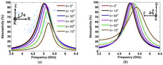 For TM polarization, an absorption spectrum over 97% was observed for to , as shown in Figure 9b. The absorption peak over 97% and 95% was obtained at 5.1 GHz and 5.2 GHz when and , respectively. Furthermore, an absorption peak of 90% was obtained at 5.34 GHz at . In the case of the incident TM mode EM wave, it was observed that the magnetic field was consistently aligned with the y-direction. This consistent alignment resulted in a stable response of the MS to the magnetic field, which allowed for strong magnetic resonance at different incident angles, thereby maintaining high levels of absorptance [].