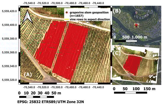 (A) Investigation area in Bernkastel-Kues within the Moselle wine region mapped on a high-precision orthomosaic (CRS (Coordinate Reference System) with EPSG (European Petroleum Survey Group) 25,832 ETRS (European Terrestrial Reference System) 89/UTM (Universal Transverse Mercator) zone 32N). Red points represent each vine position that was localized with differential-GPS (see Section 2.5 for more information) (B) Zoomed out view of the investigation area and overview of local vineyard structure and the Moselle river (mapped on Google Earth Satellite map from QuickMapService plugin in QGIS version 3.22) (C) Intermediate zoom of the investigation area, with orthomosaic on Google Earth Satellite map. It can be seen that the UAV- sensor- based orthomosaic and the Google Satellite map show some offset to each other, due to different absolute geographic accuracies and spatial resolution.