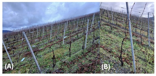 (A) Zoomed-out view of the canopy-free vine rows of the investigation area. (B) Zoomed-in view of the training system in the investigation area (photos taken in December 2024).