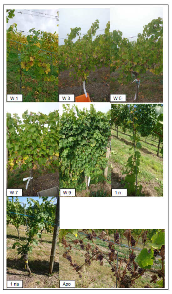 The gap between growth classes (3 to 5) does not necessarily express a linear relationship to vine vigour; rather, it provides space for intermediate classes if modifications are required to adapt or extend the assessment. For the visual standardization of the growth classes, template pictures of each growth class from a side view were taken (see Figure 3). This is especially important to reduce labeling error sources, like intra- and interpersonal errors, as much as possible. Within the classification process, only growth classes without infection type and infection strength were considered. Nevertheless, the infection has a strong impact on vine vigour [43] but was not the main focus of attention in this investigation. Accordingly, the specific characteristics of the individual infections are not described in detail here because this was not the focus of this study.