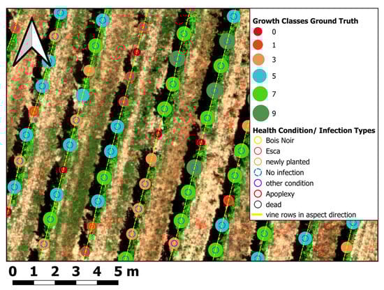 The grapevines’ geoposition were manually set, based on the high- precise RGB orthomosaics from canopy-free season generated from acquisitions during November 2021. To ensure a unique identifier for each grapevine stem, the vines were systematically numbered by each row from west to east and north to south in slope line, from top of the slope to foot of the slope, to ensure systematic geographical sorting and unique identification. Progressively, during ground truth labeling the open-source geographical digitalization App QField was used to label the vines according to the growth classification assessment after [43]. Subsequently, the attributed point-shapefiles were re-exported to QGIS version 3.22. A map of the growth class and health condition labeled grapevines after Porten [43] is shown in Figure 4. The localized and ground truth labeled vines are the basis for all subsequent geoprocessing and ML classification procedures (Section 2.6 and Section 2.7).