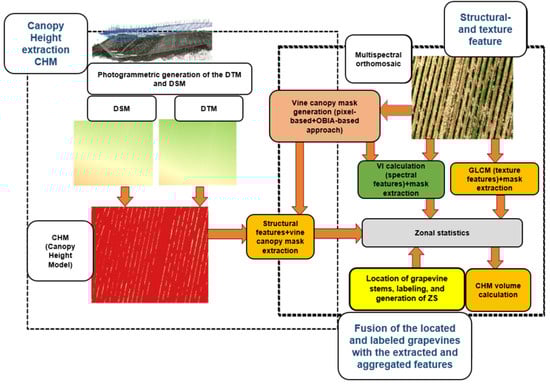 The following subsections describe the generation of the different feature types. For the spectral features, those often used in viticulture context were selected. In the case of the structural and texture features, those generally applied for crops, biomass, and vegetation volume predictions were chosen. The general assumption was that spectral, structural, and texture features used in agriculture and, more specifically, in viticulture studies should be suitable as classification input for machine learning models concerning growth class and vigour predictions.