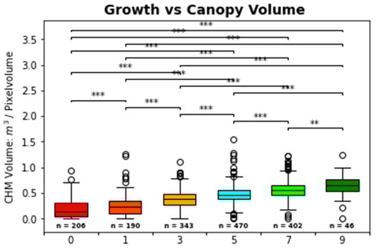 Growth class grouped CHM Volume boxplots with significance stars (*) between boxplots generated according to the Mann–Whitney-U-test with p-value significance. ** Signal greater than 0.01 (intermediate significance). *** Signal less than 0.001 (vital significance).