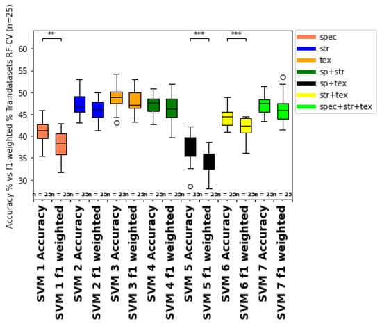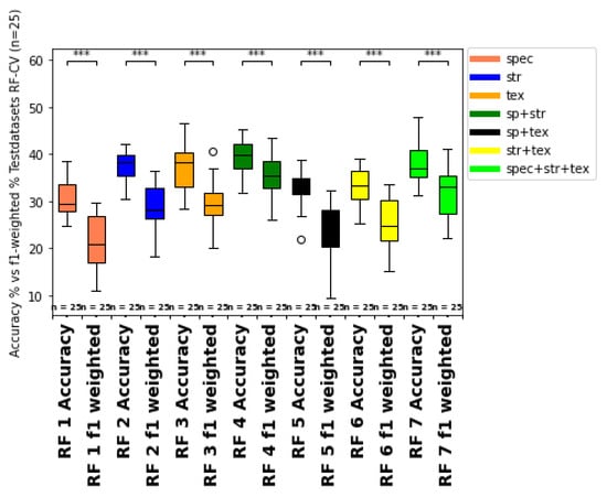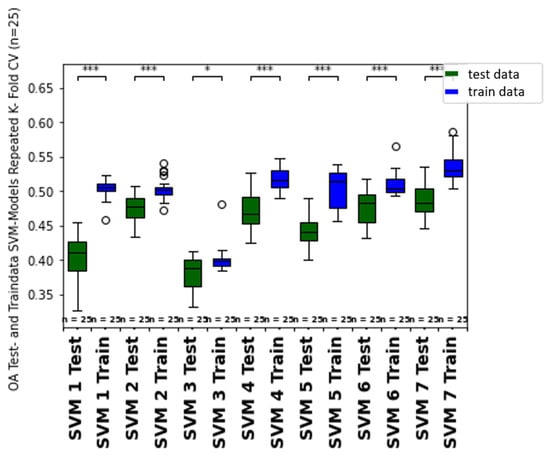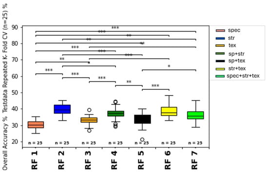 The generation of the test and training datasets of the input features were performed with repeated-k-fold- cross-validation (repeats = 5, splits = 5, random state = 1, n jobs = −1) by splitting the input data (input features and growth class ground truth) into train and test data sets. From GLCM derived features, those with the highest correlation after Pearson (calculated with RStudio version 4.3.3), to the growth classes were selected as input features in addition to the spectral and structural features. Mostly band 3 (red band) features were included in this category due to the high correlation between the red band and vegetation vigour. The RFC and SVM classifiers were chosen to fit the training data to the growth class ground truth data. These classifiers belong to the most efficient classification methods in agriculture crop and biomass prediction, and detection, including grapevine yield estimations [8]. Subsequently, the hyperparameters of the models were optimized with a hyperparameter-tuned grid search [33]. The essential steps for the model generation are summarized in Table 7. The model’s output generated n = 25 single metric outputs for each growth class. These values were used for univariate statistics and the evaluation of the consistency of the metrics’ output. For model evaluation, the validation metrics were calculated for the train and test data to search for overfitting and underfitting tendencies. The models and the validation metrics (accuracy, f1-weighted) were selected based on literature sources, primarily, biomass estimation and crop modeling research. Nevertheless, the specific geometrical properties of vine canopies and class frequency balance of the label dataset were also considered by several authors [91,92,93], adapting the classification procedure accordingly. These aspects are also shortly considered in the discussion section (see Section 4.4). Furthermore, the f1-weighted scores were calculated to test for the impact of imbalance on the generated dataset [93,94,95]. To quantify the statistical difference of the average model prediction metric results, the Mann–Whitney-U-test was applied for all model combinations (1–7) and metric pairs (accuracy vs f1-weighted). Moreover, the class-specific accuracy (confusion matrix) was calculated for the model output with the best overall accuracy score. Additionally, user and producer accuracy were calculated. The user accuracy for each growth class was calculated as the ratio of the sum of all correctly identified growth classes for this class, divided by the sum of all other incorrectly labeled growth classes for the same growth class and expressed in %. For producer accuracy, for each growth class, the sum of all correctly identified growth classes for this growth class was divided by the sum of all other incorrectly (ML model) predicted growth classes for the same growth class and also expressed in %. This approach allowed for a more specific discussion of the classification results and trends of the individual growth classes (see Section 4.6).