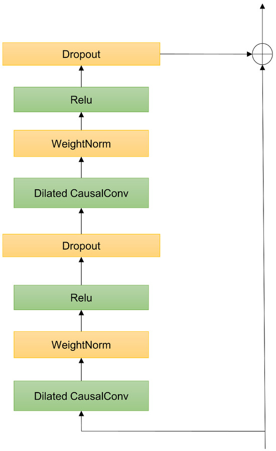 TCN is a 1D deep convolutional network designed for processing time series data, capturing local feature information of the input sequence through one-dimensional convolutional kernels. TCN primarily consists of causal dilated convolutions and residual connections [27], as illustrated in Figure 1.