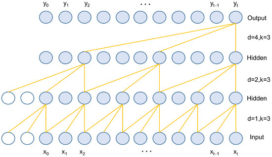 Time series data exhibit causal relationships, where the output at the current moment is determined only by the inputs from past moments and not by future data. The causal dilated convolution structure, shown in Figure 2, is primarily used to capture dependencies between features at the current and past moments, as depicted in Figure 2. The input to the nodes in the upper layer of the neural network originates from the corresponding nodes in the lower layer and their preceding positions. To achieve a larger receptive field and capture longer dependencies, numerous additional hidden layers are required between the output and input layers.