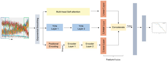 The primary objective of this study is to enhance the accuracy of RUL prediction. To fully leverage the temporal and sensor information in the aero-engine data, a three-branch Transformer-TCN-Self-attention network with feature fusion for the life prediction of aero-engines is proposed. The structure of the model is shown in Figure 5. It mainly consists of exponential smoothing, multi-head self-attention, TCN layers, encoder layers, and fully connected layers. The model first applies exponential smoothing to the input data for smoothing; then, the entire input feature time series are processed in parallel through 2 layers temporal convolutional network to extract local degradation features. Each layer of the network uses a convolution kernel of size 3 and an activation function of ReLU; to fully extract global features, another branch uses 2 layers of transformer encoders in parallel to extract global degradation features from multivariate time series The number of attention heads in each encoder layer is 2, and the number of neurons in the feedforward layer is 28; to distinguish the contribution of different input sensor features to the prediction, the third branch employs multi-head self-attention to allocate weights across the sensor dimensions of the time series and the number of attention heads is 5; the outputs of the three parts are then fused through linear layers; finally, the feature map is expanded into a one-dimensional matrix, and a fully connected layer is used to establish the mapping relationship between the feature matrix and the RUL label, obtaining the RUL prediction value. The fully connected layer consists of 3 layers, with the number of neurons in each layer being 100, 50, and 1, respectively. The activation function for the first two layers is ReLU, and the last layer is a linear layer.