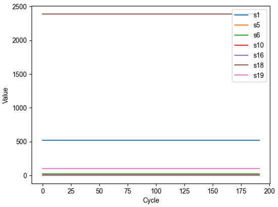 The FD001 subset of the C-MAPSS dataset contains a total of 21 sensor monitoring parameter status data. Although multidimensional features contain more degradation information of the engine, high-dimensional input features also increase the difficulty of engine life prediction, leading to inaccurate model predictions. Therefore, it is necessary to select features with more degradation information from the multivariate features and eliminate sensor variables with less information. In Figure 6, the horizontal axis represents the number of flight cycles, and the vertical axis represents the sequence number of the variables. From Figure 6, it can be seen that as the number of engine cycles increases, features such as Total temperature at fan inlet, Pressure at fan inlet, Total pressure in bypass-duct, Engine pressure ratio, Burner fuel–air ratio, Demanded fan speed, and Demanded corrected fan speed in the FD001 dataset show no significant change trends, with constant values, and have no impact on remaining life prediction. Therefore, these features are eliminated from the 21 features, and the remaining sensor status monitoring data, totaling 14 features, are selected as the model’s input.