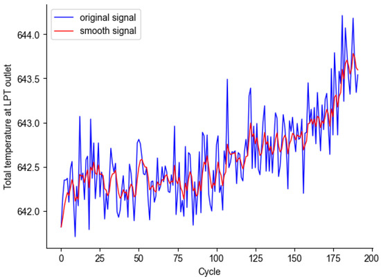 where represents the sensor data value at time t, is the corresponding value after smoothing, and is the smoothing coefficient, with a range of [0,1]. A larger value results in a more fluctuating curve, while a smaller value results in a smoother curve. To smooth the sensor signal while retaining degradation information as much as possible, is set to 0.3. The smoothing effect on the Total temperature at LPT outlet of the second engine in FD001 is shown in Figure 7.