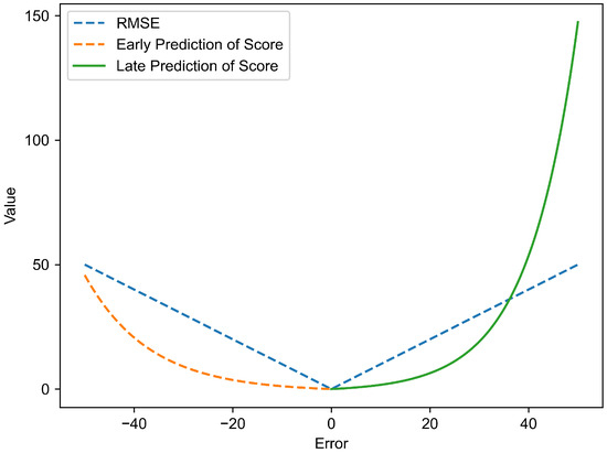 Root Mean Square Error (RMSE) can represent the average of squared error between predicted and actual values. For the RUL prediction of engines, early predictions are better than late predictions. The score can distinguish between early and late predictions, penalizing late predictions more heavily compared to early predictions [29]. Therefore, to comprehensively evaluate the performance of the RUL model, this study employs two metrics: RMSE and Score. Score is an asymmetric evaluation metric that provides a score based on the difference between the predicted results and the true values, as shown in Figure 10. The horizontal coordinate error in Figure 10 represents the difference between the predicted value and the true value. If the predicted result is less than the true value, it is considered an early prediction, resulting in a lower score; if the predicted result is greater than the true value, it is considered a delayed prediction, resulting in a higher score. The smaller the values of these two metrics, the better the model’s performance.