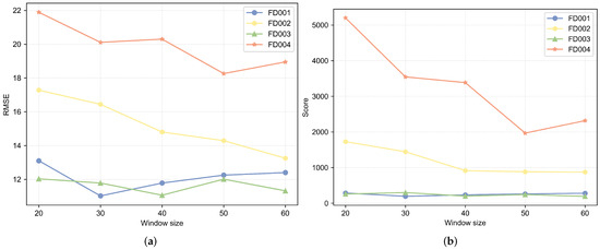 A smaller time window results in fewer degradation information contained in the data samples. A larger time window contains more degradation information. Experiments were conducted to study the impact of different window widths on the model’s predictive capability. In the experiments, the range of the window width was set from 20 to 60, with a step size of 10. The experimental results are shown in Figure 11. As can be seen from Figure 11, in the FD001 dataset, the RMSE and Score are minimized when the window size is 30. In the FD002 dataset, the RMSE and Score are minimized when the window size is 60. In the FD003 dataset, the RMSE and Score are optimal overall when the window size is 40. In the FD004 dataset, the RMSE and Score are minimized when the window size is 50. Compared to single-condition datasets, multi-condition datasets have a larger window width. This is because multi-condition datasets are more complex and the model requires more degradation information.