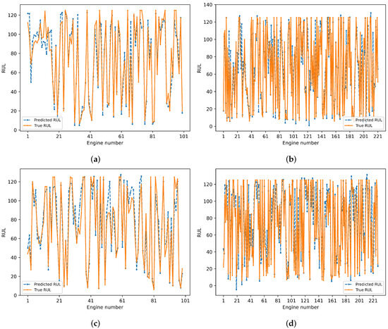 Prediction results of proposed model. (a) Prediction results of model on FD001. (b) Prediction results of model on FD002. (c) Prediction results of model on FD003. (d) Prediction results of model on FD004.