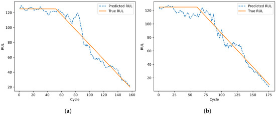 Prediction results of engines. (a) Testing engine 1 on FD002. (b) Testing engine 185 on FD002.