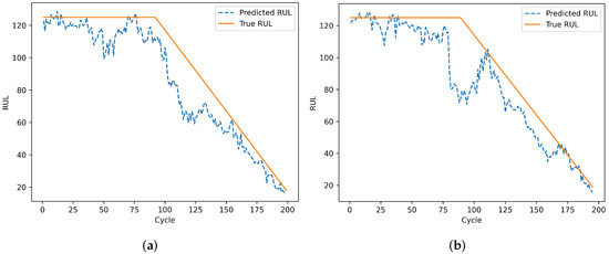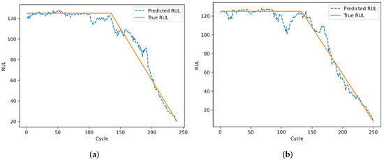 Prediction results of engines. (a) Testing engine 78 on FD003. (b) Testing engine 99 on FD003.