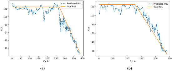 To evaluate the model’s prediction results on individual engines, engines 24 and 76 from the test set of dataset FD001 and engines 1 and 185 from the test set of dataset FD002 were selected. Engines 78 and 79 from the test set of dataset FD003, and engines 135 and 213 from the test set of dataset FD004 were also selected. The remaining useful life prediction results are shown in Figure 13, Figure 14, Figure 15 and Figure 16. From Figure 13 and Figure 15, although the model prediction curves exhibit some fluctuations, the overall fit between the predicted values and the true values is high. As the number of engine cycles increases and more degradation information accumulates, the model’s prediction results improve. From Figure 14 and Figure 16, compared to FD001 and FD003, the engine prediction curves for FD002 and FD004 show significant fluctuations and poor fitting. The reason is that FD002 and FD004 have multiple operating conditions, making the data more complex, and the model’s extracted features are insufficient. During the degradation phase before a fault occurs, the model’s predicted values are lower than the true operating state values of the engines, enabling the early prediction of the remaining useful life of aero-engines, which has practical predictive value.