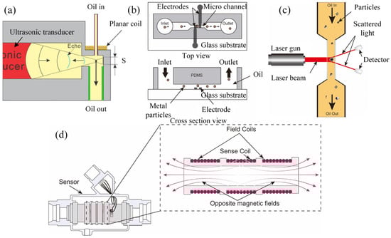 Schematic diagram of the wear debris monitoring techniques. (a) Acoustic-based ultrasonic-based oil debris sensor []; (b) electrical-based microfluidic capacitive Coulter sensor []; (c) optical-based light scattering wear debris sensor [,]; (d) magnetic-based Metalscan sensor [,].