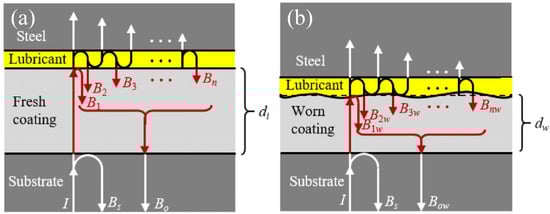 Schematic illustrating ultrasonic wave propagation through (a) an unworn coating–lubricant–steel assembly, and (b) a worn coating–lubricant–steel assembly with diminished coating thickness. Here, the worn coating thickness (dw) is defined as the initial coating thickness (di) minus the wear depth, while d represents the lubricant film thickness [].