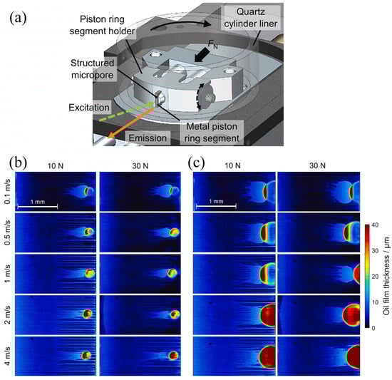 (a) Structure of the optical system. Oil tail images under sliding speeds ranging from 0.1 to 4 m/s and normal loads of 10 N and 30 N. (b,c) Images using surfaces with varied pore sizes of 200 μm and 500 μm, respectively [].