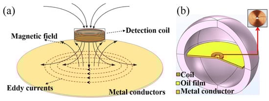 A model with an eddy current coil for oil film thickness detection is established by coupling electromagnetic and temperature fields. (a) Model for the proposed sensor, and (b) corresponding 3D model [].