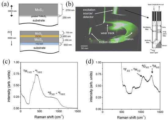 Wear sensor based on luminescence, where a luminescent coating is placed in the middle region of the multilayer coating for the detection of wear depth and warning of coating failure []. (a) Structure of the multilayer coating with embedded YSZ film as wear sensor. (b) Photograph of the monitoring system equipped on a tribometer, and the schematic of the laser probe. Luminescence spectra from (c) erbium-doped YSZ film and (d) samarium-doped YSZ film.