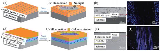 Different strategies for using luminescent layers in coating and their corresponding functional effects []. (a) Schematic diagrams of the coating with luminescent particles doped into the top layer. (b) Cross-sectional image of Ni/BAM layer deposited on the top of the substrate. (c) Luminescent image of the worn coating. (d) Schematic diagrams of the coating with luminescent particles doped into the mid-layer. (e) Cross-sectional image of coating with Ni/BAM layer between functional layer and substrate. (f) Luminescent image of the worn coating.