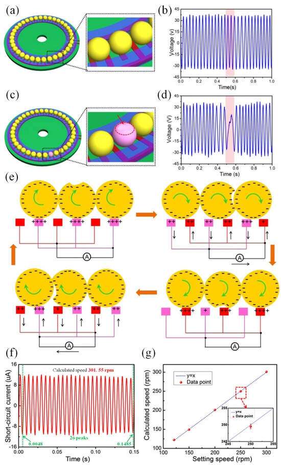 “Self-powered” sensor with bearing-based TENG []. (a) Schematic diagram of the unworn ball-bearing-based TENG sensor, where the red color corresponds to the interdigital electrode. (b) Output voltage with the unworn TENG sensor during the rotation process. (c) Schematic diagram of the ball-bearing-based TENG sensor with severe wear. (d) Output voltage with the worn TENG sensor during the rotation process. (e) Schematic diagrams of the working principles of the TENG with a severely worn bearing ball. (f) Calculation of rotation speed with the obtained signal. (g) Comparison between the calculated results and the set values. The calculated rotation speed is in accordance with the setting speeds.