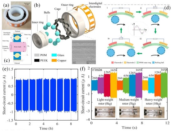 TRBB with self-powering and self-sensing performances []. (a) Photograph, (b) schematic diagram, and (c) cross-sectional structure of the TRBB, where an interdigital electrode was placed on the surface of the outer ring of the bearing to avoid direct contact between the bearing balls and the electrode. (d) Schematic working principle of the TRBB at different free-standing modes during the rolling process. (e) Durability test results indicate that the TRBB can provide stable short-circuit current. (f) Test results indicate that the TRBB can successfully monitor rotation speeds under different loads.