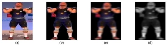 The pre-processing steps are as follows: (a) raw frame extracted from a video of Clean & Jerk, (b) background noise removed, (c) sharpness reduced and edges smoothed, and (d) 3D image converted to 2D.