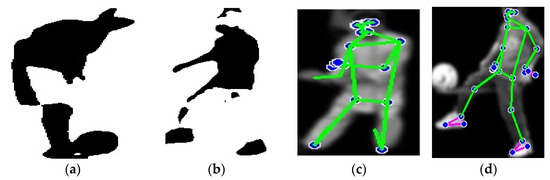 Binary images of humans after silhouette extraction: (a) UCF-101; (b) YouTube, illustrations of human pose estimation by key points; (c) UCF-101; (d) YouTube.