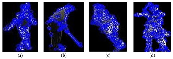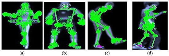 Feature extraction is a common step in almost all machine learning and computer vision activities in which raw data are transformed into a form that is easily understandable by a model. The feature extraction [68,69,70] concept entails identifying characteristics or features that are important when it comes to the identification of a conclusion that will make it possible to use the obtained data as an input of the machine learning domain. This process involves recovering features in the image or the frames of the video that might be edges, corners, or texture. In our system, we use six feature extraction techniques: BRIEF, HOG, FAST, and optical flow for each full-body (silhouette) image, and SURF, degree of freedom, distance transform, and MSER for skeleton or joint points. The feature extraction technique known as SURF or Speeded-Up Robust Features is widely used in computer vision. It finds the combination of interest points within an image and calculates the respective descriptors, which helps in recognizing important patterns and textures. Specifically, the SURF is built to be scale- and rotation-invariant, so that the features it finds within the image should not change when the latter is transformed in one way or another. It works in the following way: the method optimizes the approximation of the Hessian matrix for detecting key points, which, despite making the method much faster than SIFT, does not significantly reduce its performance. In practice, SURF finds several interest points by identifying the determinant of the Hessian matrix and then constructing descriptors with the help of the pixel intensity of the local surroundings. Key point detection using the Hessian matrix is explained in Equation (4).
