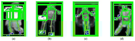 where is joint probability distribution of all key point coordinates, is the probability of key point , and is the probability of the spatial relationship between key points i and j, based on their relative positions. The probabilities and were determined using Gaussian functions (PDF). measures how likely a pixel is part of the foreground, while accounts for the spatial relationships between neighboring pixels. The parameters of these functions were estimated using training data. In some cases, heatmaps generated by a CNN were used to define , where the intensities in these heatmaps were interpreted as the likelihood of the pixel being part of the foreground. These values were then applied in the calculation of spatial relationships in . Figure 3 shows the human detection applied to both datasets.