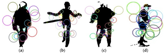 Example of SURF and those circles are showing the extracted keypoints: (a,b) UCF-101 and (c,d) YouTube.