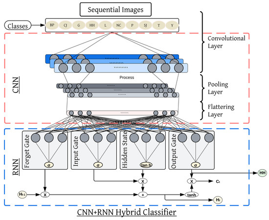 In the second case where the elements are ordered, Recurrent Neural Networks, especially Long Short-Term Memory (LSTM) and Gated Recurrent Units (GRUs), are extremely useful. RNNs are capable of maintaining some information from the previous steps to understand the sequence of the occurrence and hence can be used to handle sequential data. Similar to the initial processing of individual video frames, in the hybrid model of CNN-RNN, feature vectors representing spatial information for each frame are generated. The RNN then feeds these vectors by tracking changes as a sequence of the frames to look for temporal patterns. For tasks such as recognizing programs associated with sporting activities or describing events occurring in videos, this technique allows the model to learn not only what is going on frame by frame but also how actions transform in time. One of the main features of the design is the ability to blend spatial and temporal organization, making it highly feasible for controlling complex data over time. Figure 14 is the functional structure of our proposed hybrid classifier. Algorithm 1 shows the basic functional architecture of this hybrid classifier.