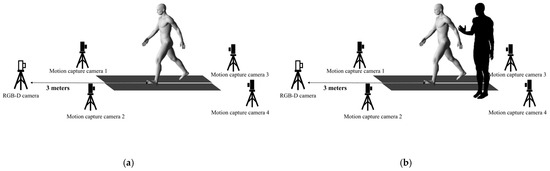 Setup adopted for the data acquisition process. The two panels show a sketch of the setup including the position of the four infrared (black) and one RGB (white) cameras. (a) This setup was adopted for data acquisition when the participant walked without assistance. (b) This setup was adopted for data acquisition when the participant walked with assistance. The assistant was positioned to the participant’s left.